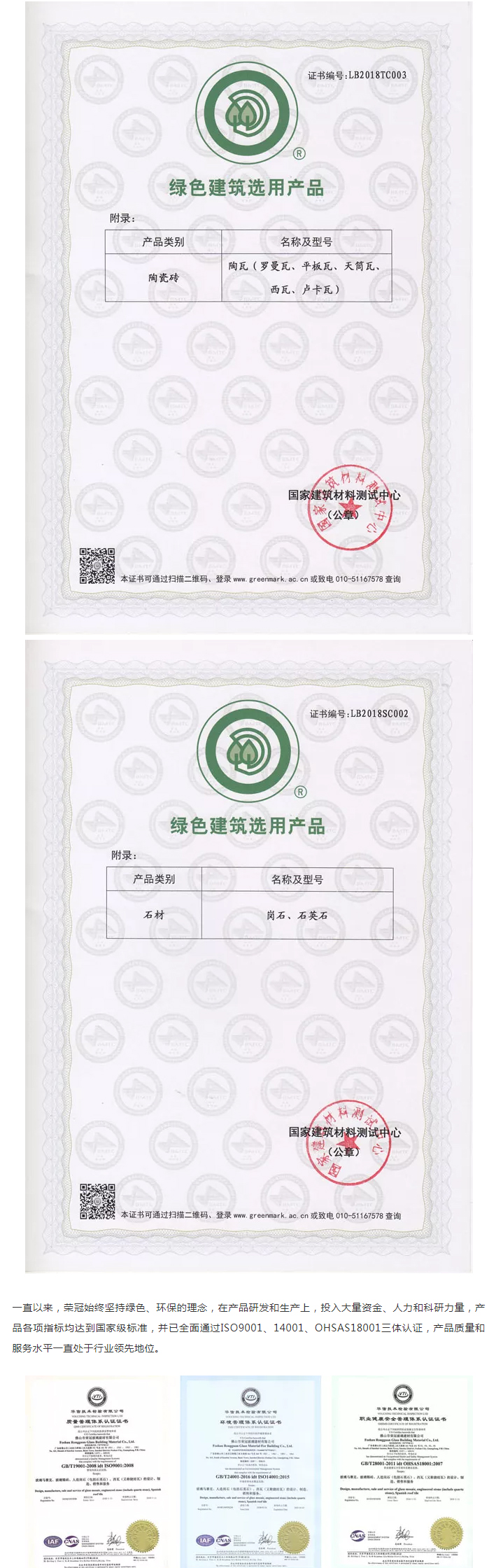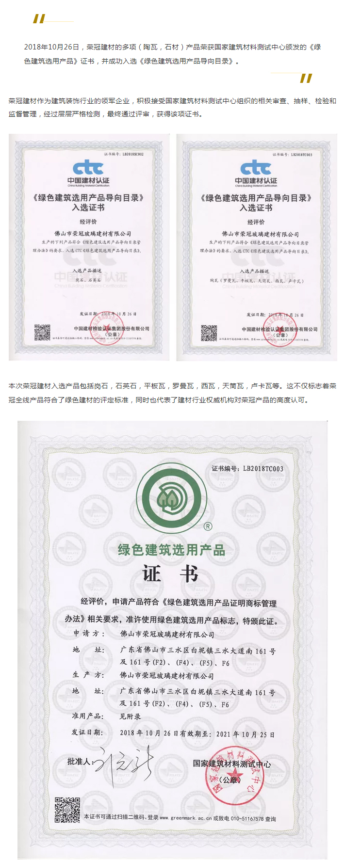 榮冠建材多項產品榮獲"綠色建筑選用產品",并入選"綠色建材選用產品導向目錄"