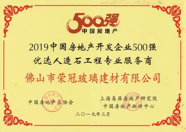 榮冠石材憑借眾多房地產企業和裝修行業的高度認可,獲得了中國房地產業協會和中國房地產測評中心聯合頒發的“2019中國房地產開發企業500強優選人造石工程專業服務商”的榮譽。