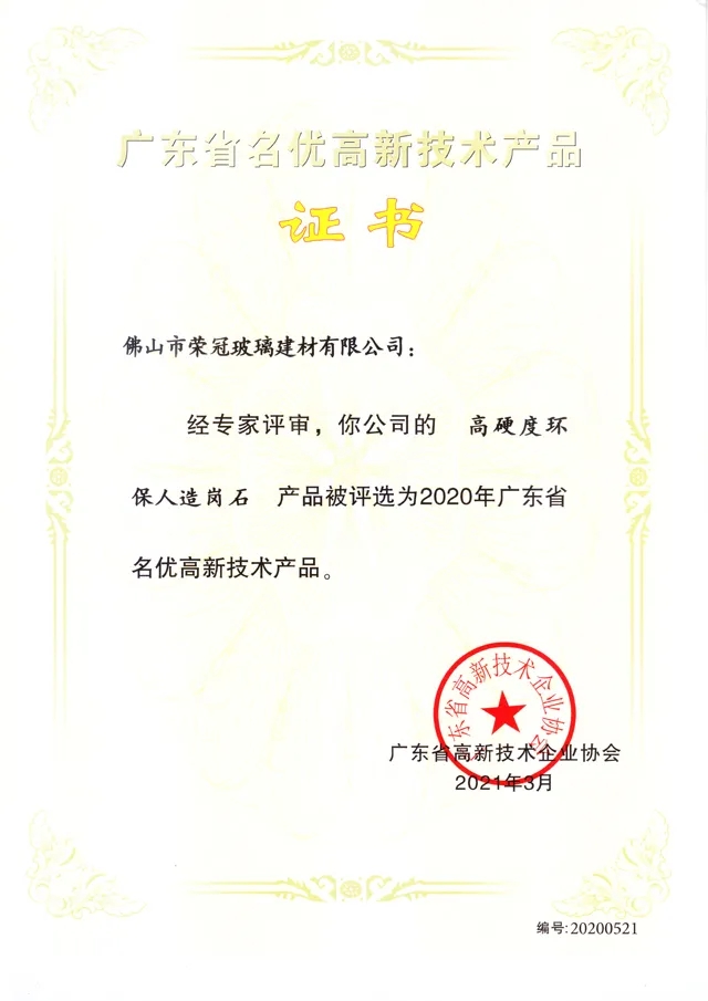 榮冠公司憑借的“高硬度環保人造崗石”產品成功入選,斬獲廣東省高新技術產品稱號,標志著榮冠公司在人造石領域的綜合優勢和核心競爭力。