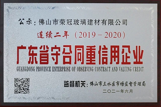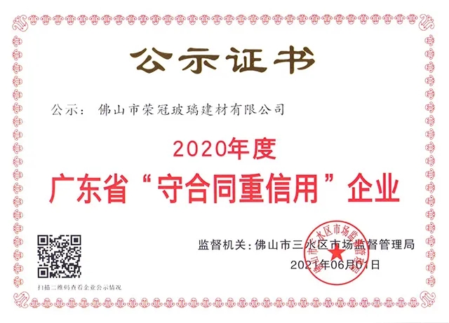 近期,佛山市三水區(qū)市場監(jiān)督管理局對2020年度廣東省“守合同重信用企業(yè)”進(jìn)行公示,榮冠公司憑借良好的市場信譽(yù)和優(yōu)質(zhì)的產(chǎn)品服務(wù),順利通過市場監(jiān)管部門的最終評審,并獲相應(yīng)的榮譽(yù)牌匾和證書。在三十多年的誠信經(jīng)營中,榮冠公司屢獲該項(xiàng)殊榮。
