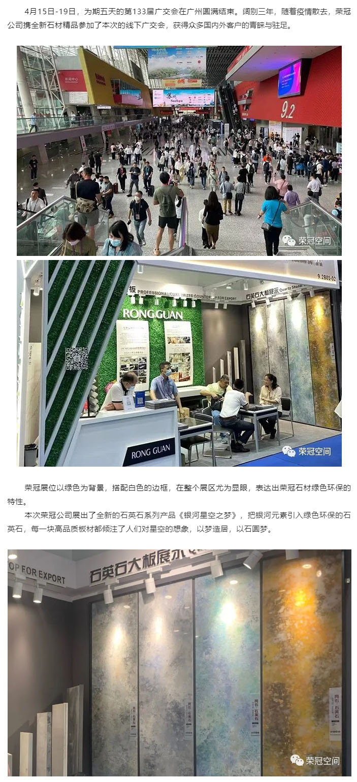 4月15日-19日,為期五天的第133屆廣交會在廣州圓滿結束闊別三年,隨著疫情散去,榮冠公司攜全新石材精品參加了本次的線下廣交會,獲得眾多國內外客戶的青睞與駐足。