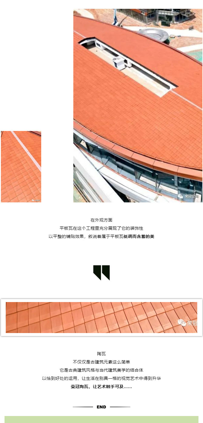 榮冠平板瓦,作為最具實用性的屋面瓦,其平整的瓦面,不僅能最大程度地展現(xiàn)屋面整齊劃一的美感,還能減少雜物在屋面上的堆積,這也是平板瓦深受客戶喜歡的原因之一