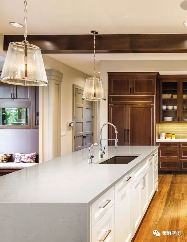 從石英石臺面的色澤花紋搭配,到邊型加工和凹槽加工,每一個細(xì)節(jié),榮冠石英石都無比講究,附著于切割精致的柜體上方,給人強烈的生活質(zhì)感。